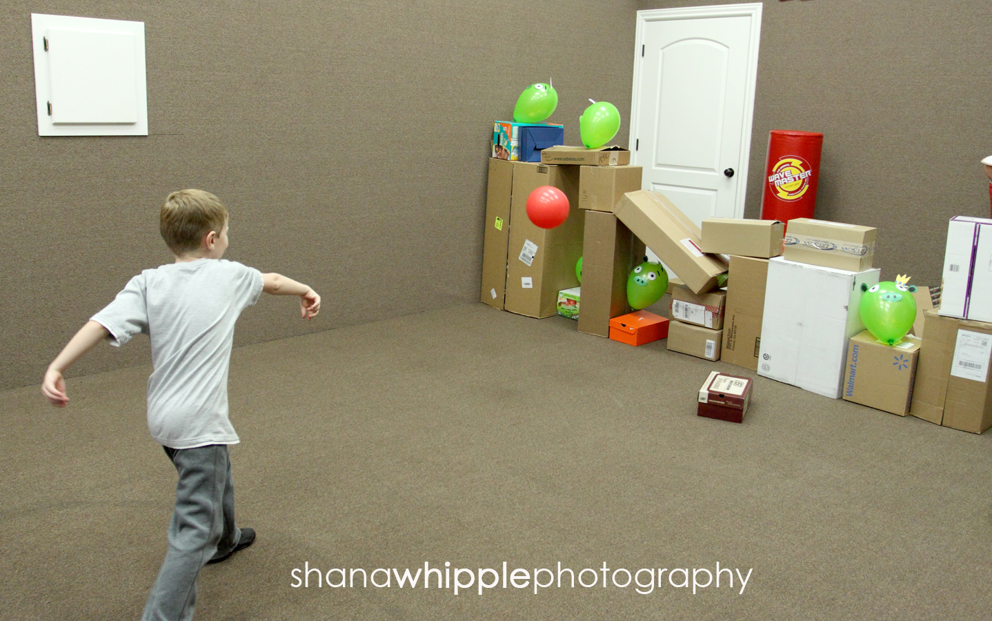 For weeks I collected boxes from my neighbors and friends and the boys had no idea what was in store for them as they walked in. I wish I could have videoed their reaction to this! They were dying! Boys, boxes, balls, balloons and destruction. They were all over this!